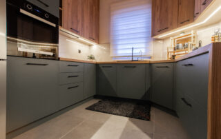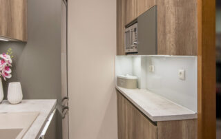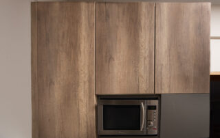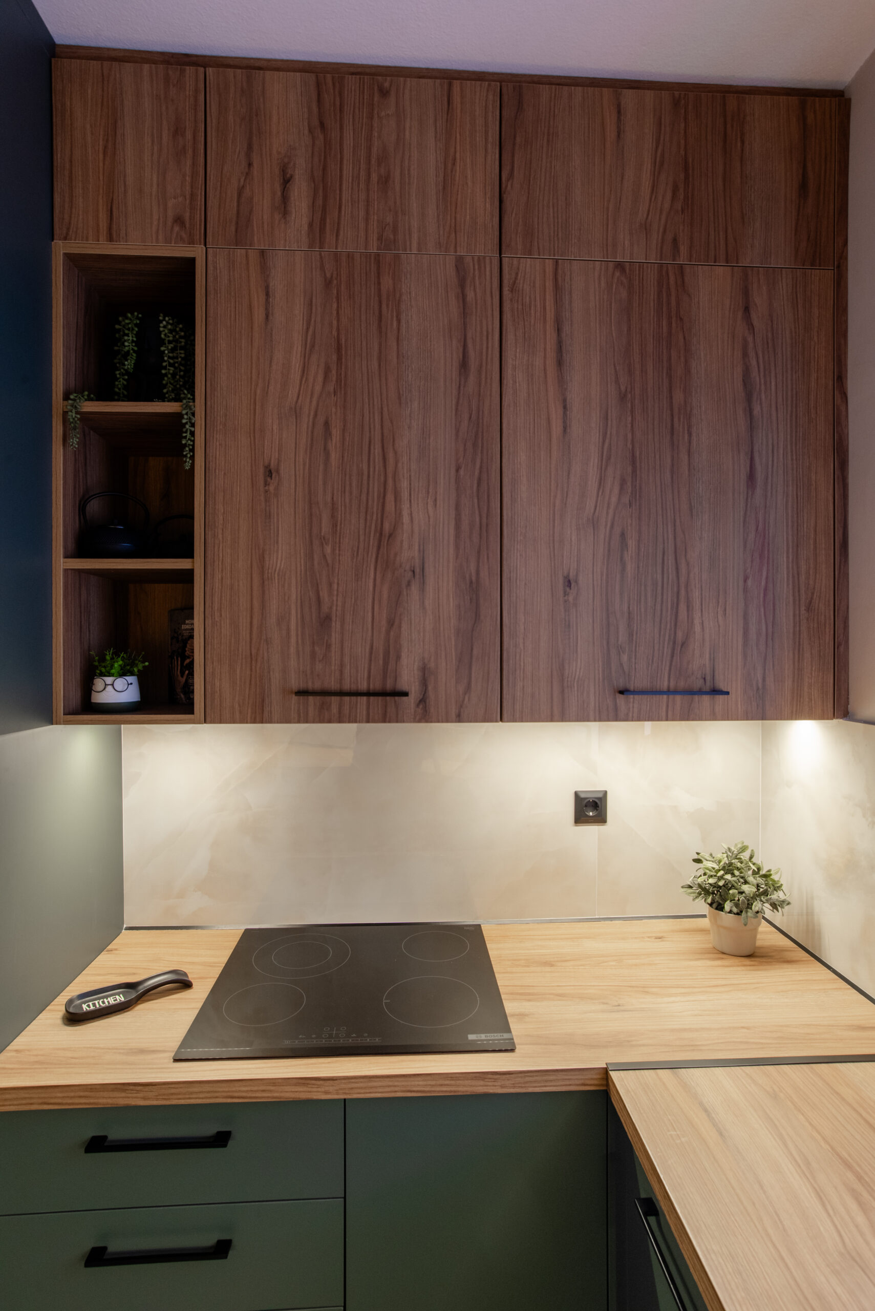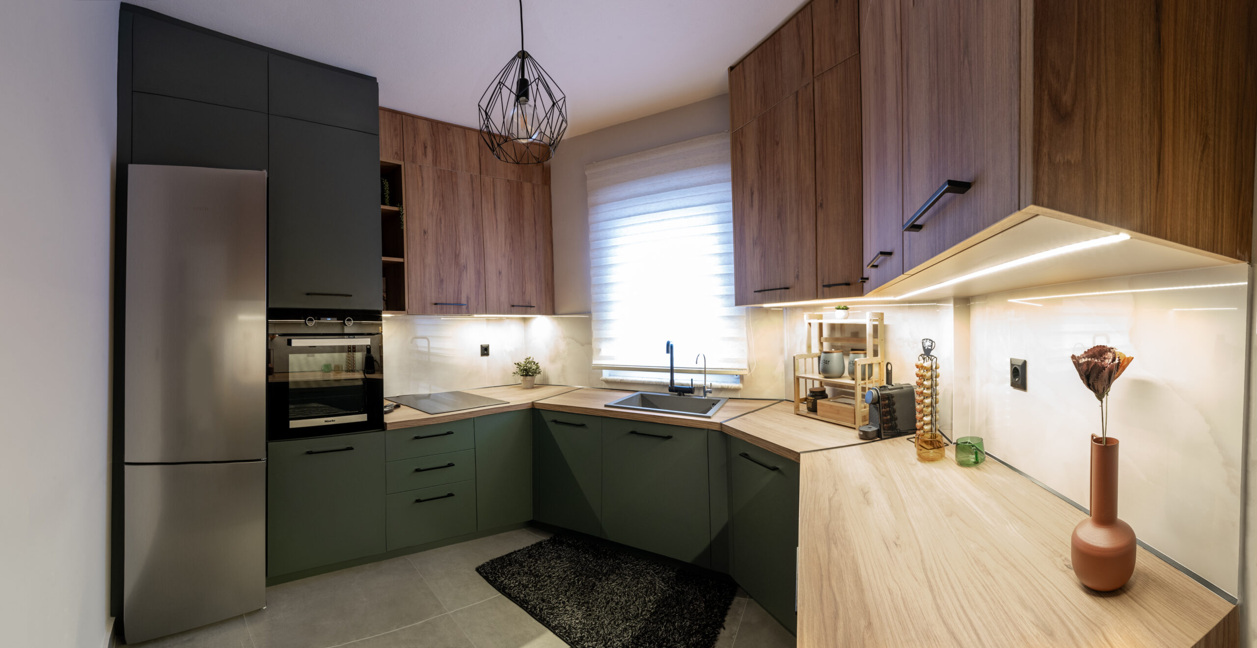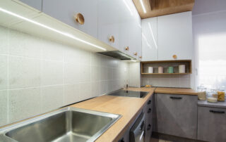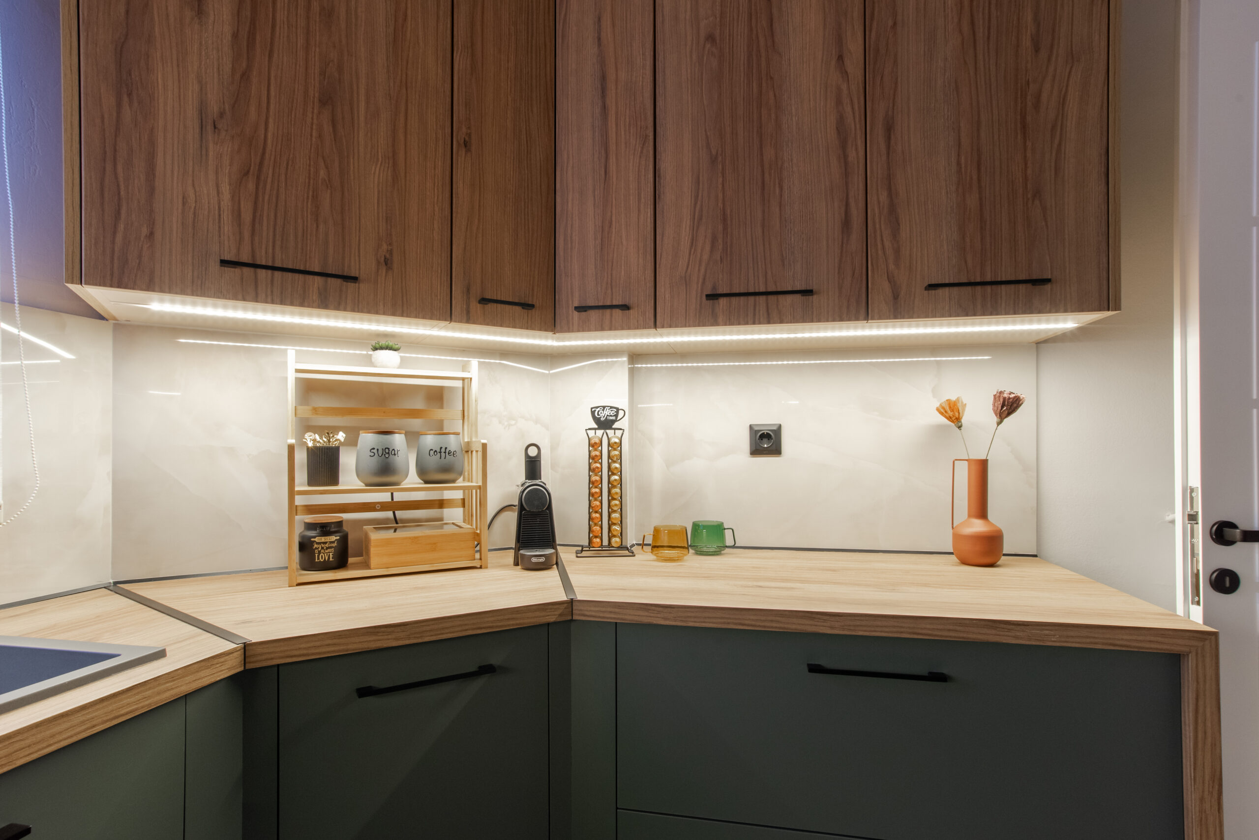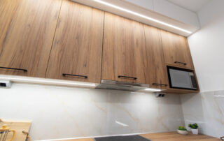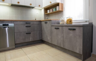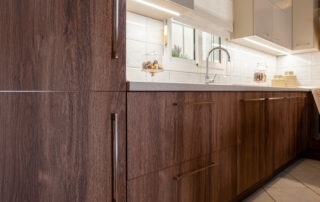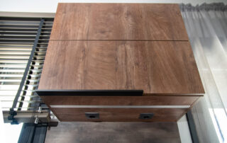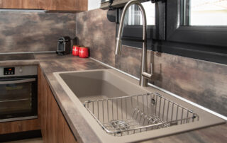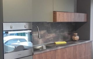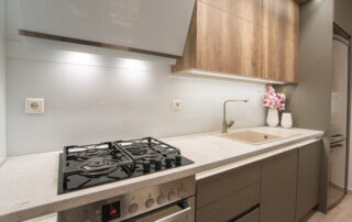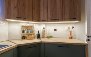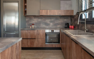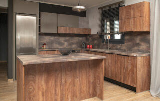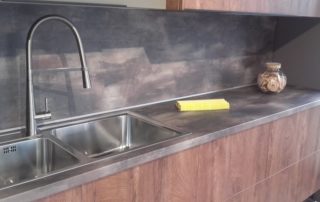 Η σύνθεση του πάγκου κουζίνας αποτελείται – με απλά λόγια – από ένα φύλλο HPL RESOPAL® πάχους 0,8 χιλιοστών, μορφοποιημένο σε προφίλ πάγκου και κολλημένο πάνω από το μπροστινό άκρο μοριοσανίδας πάχους 38 χιλιοστών. Επιπλέον στο κάτω μέρος είναι σφραγισμένος με ειδική αδιάβροχη υδατοφραγή.