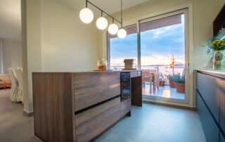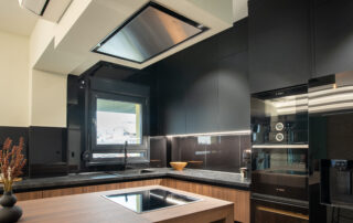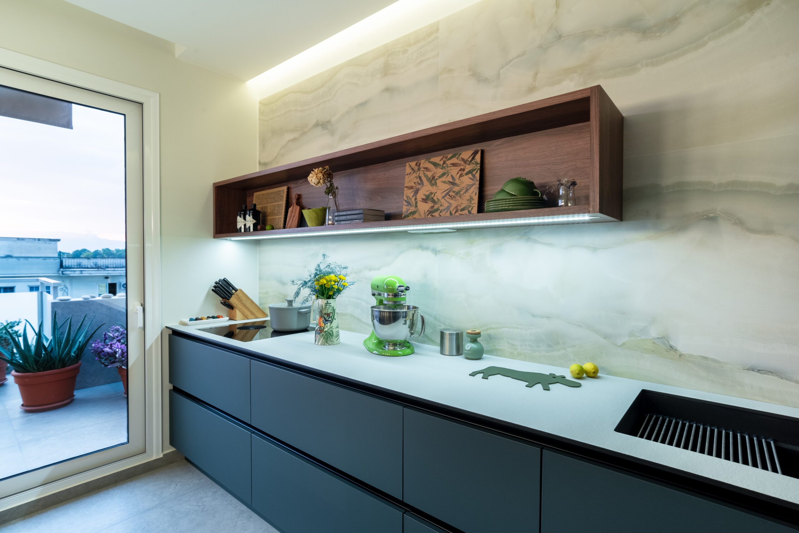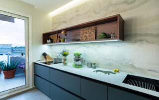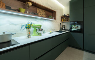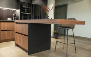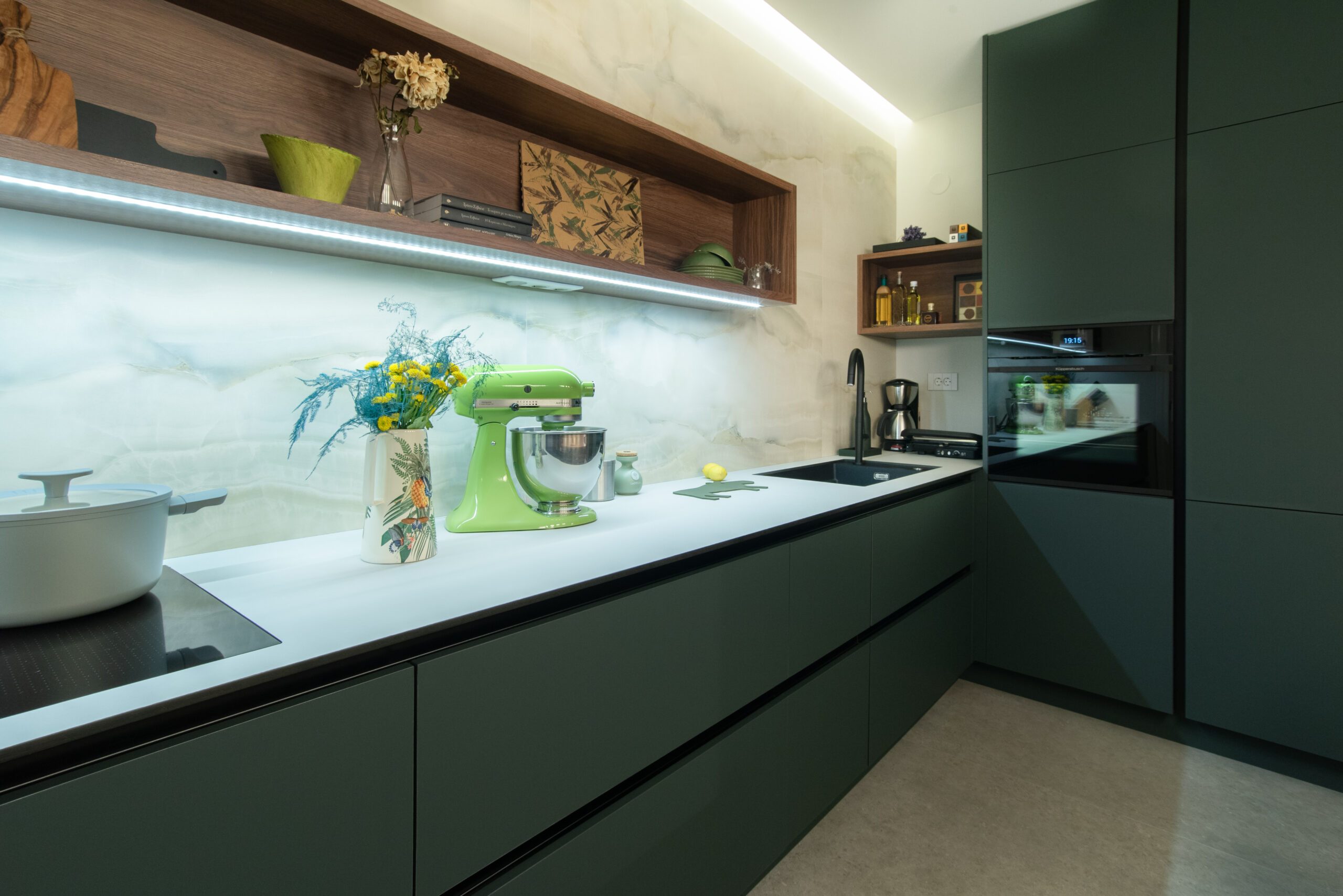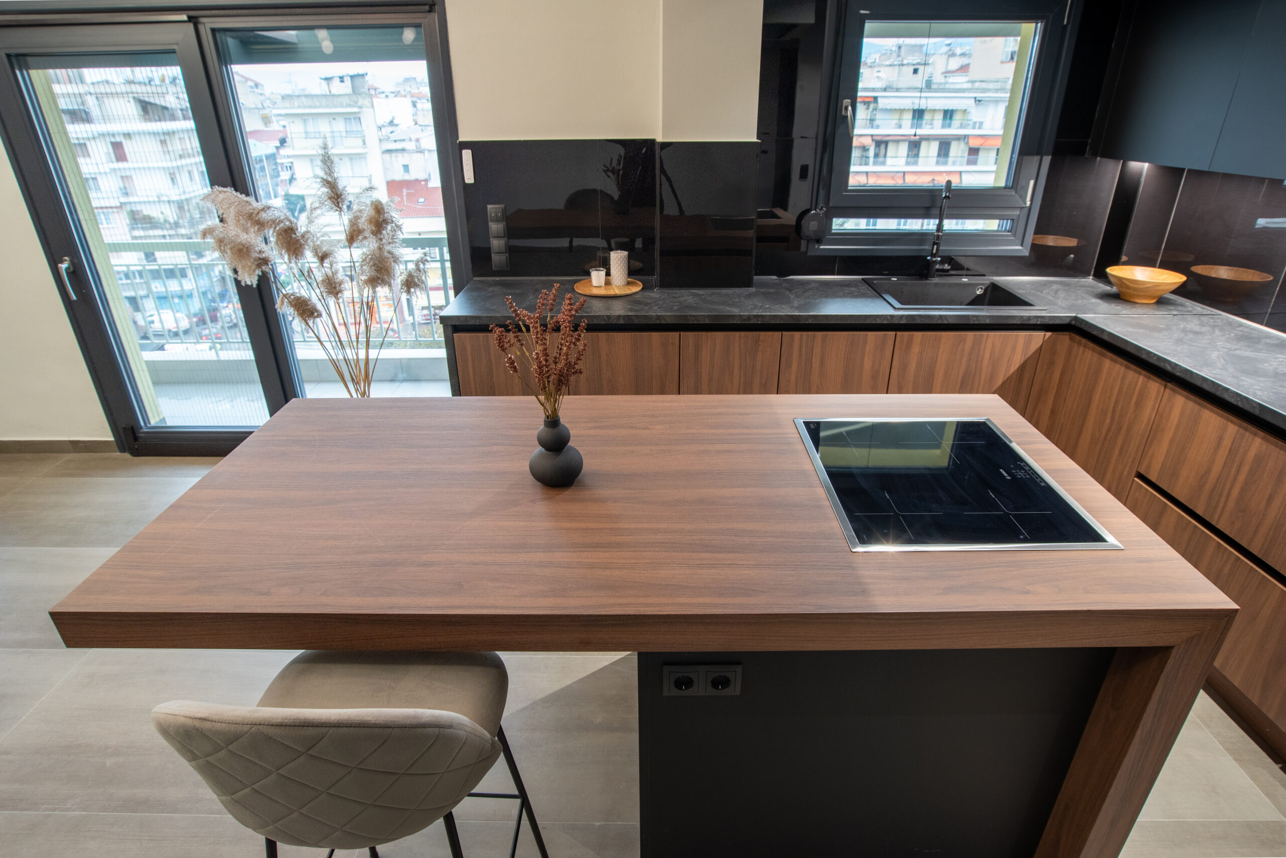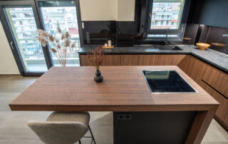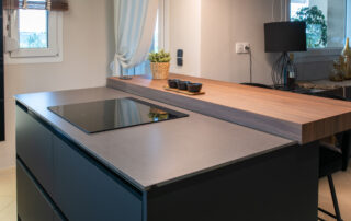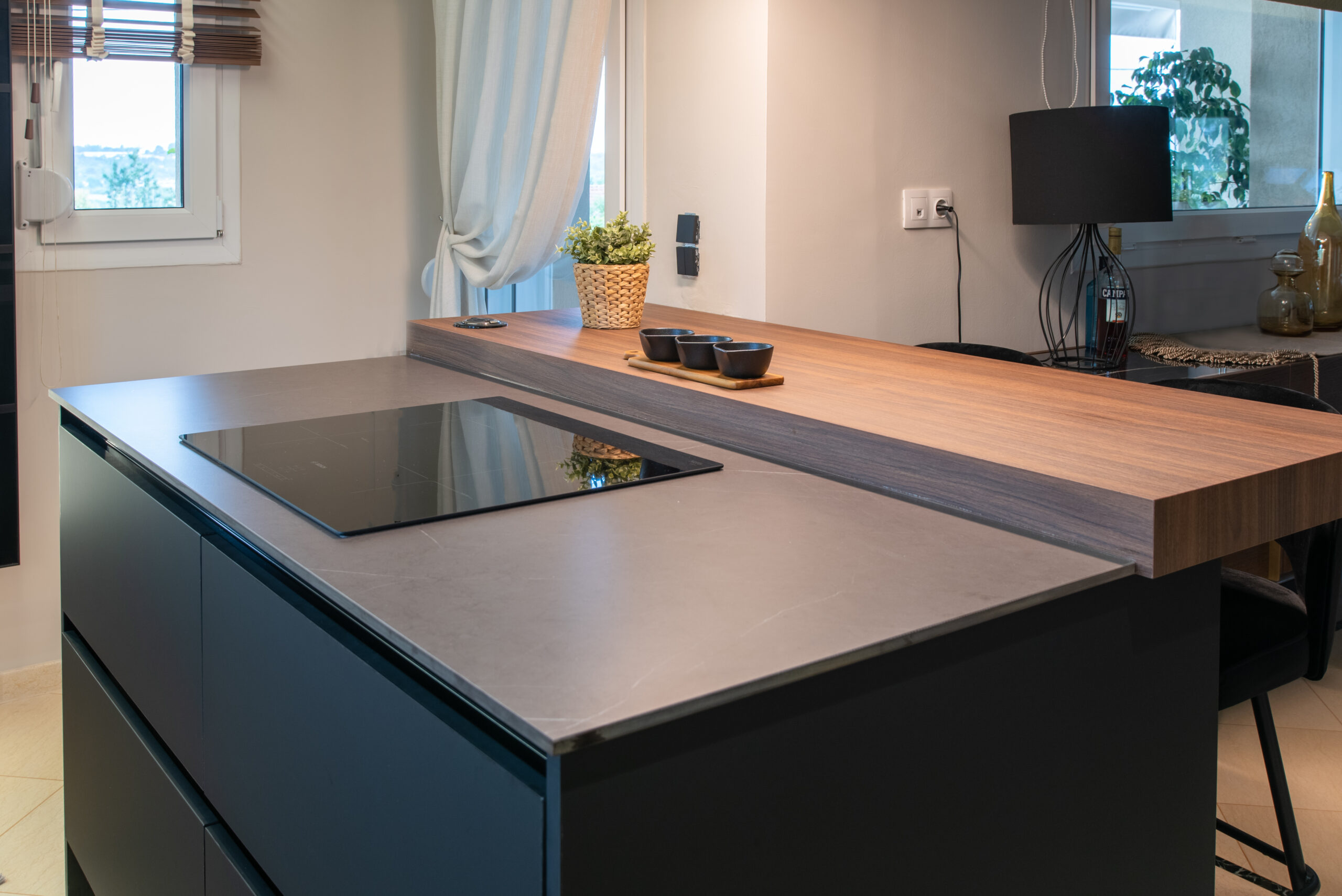 Η σύνθεση του πάγκου κουζίνας αποτελείται – με απλά λόγια – από ένα φύλλο HPL RESOPAL® πάχους 0,8 χιλιοστών, μορφοποιημένο σε προφίλ πάγκου και κολλημένο πάνω από το μπροστινό άκρο μοριοσανίδας πάχους 38 χιλιοστών. Επιπλέον στο κάτω μέρος είναι σφραγισμένος με ειδική αδιάβροχη υδατοφραγή.