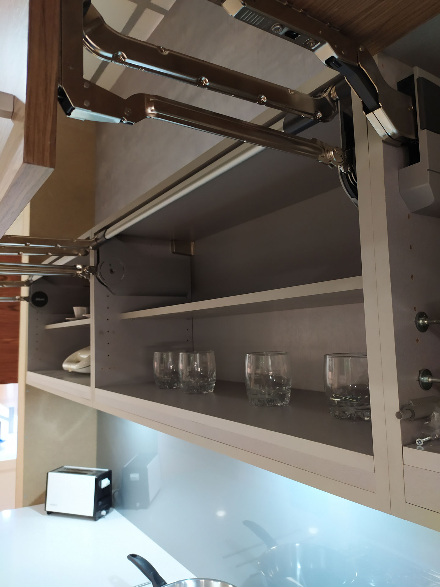 Περιλαμβάνει συρτάρια και κομπάσα στα κρεμαστά ντουλάπια τις εταιρείς Blum και είναι με φρένο, πάγκο γρανιτένιο τις εταιρείας schock, πάγκος νησίδας 4cm με τραπέζι, νεροχύτη γρανιτένιο Blanco μονό μεγάλο, βρύση σε χρώμα γρανίτη schock, εστία smeg 3 αερίου και 1 εμαγιέ, 1 εσωτερικό συρτάρι blum με κουταλοθήκη πλαστική 90κουτί,σετ διαχωριστικά στα συρτάρια orga-line blum, πιατοθήκη inox 90κουτί, πιατοθήκη ξύλινη σε συρτάρι 90 κουτί, δοχείο απορριμμάτων ( 3 δοχεία ) σε συρτάρι 90κουτί και σποτ χωνευτό κάτω από τα κρεμαστά ντουλάπια. Διαστάσεις τοίχου κουζίνας 2,72 και τις νησίδας 2,60.